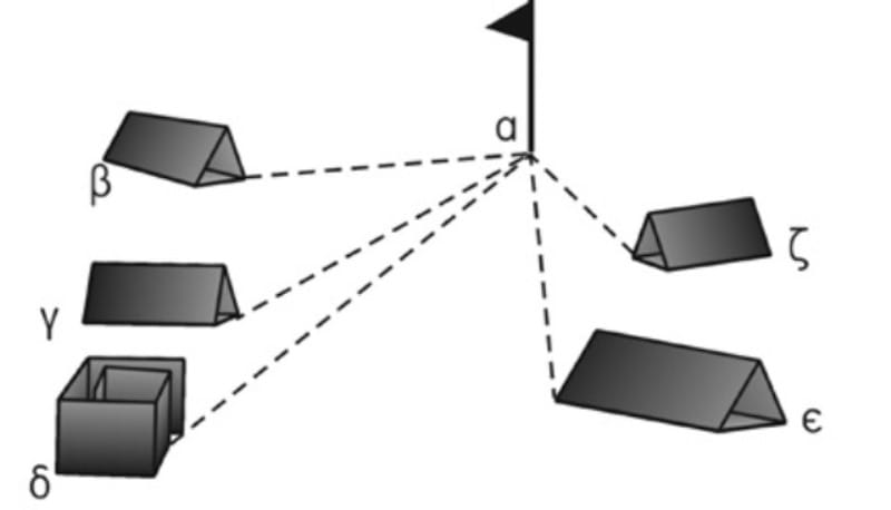 Διάλεξε ένα κεντρικό σημείο (α) του χώρου που θέλεις να απεικονίσεις, από το οποίο να μπορείς να δεις και να σκοπεύσεις όλα τα υπόλοιπα σημεία που θέλεις να αποτυπώσεις. Στάσου στο σημείο α και μέτρησε με σκοπεύσεις τα αζιμούθια και με βήματα τις αποστάσεις των σημείων β, γ, δ, ε , ζ. Αν είστε ομάδα, καλό είναι το ίδιο μέλος της ομάδας να κάνει όλες τις μετρήσεις και ειδικά τα βήματα, για να έχουν όλα το ίδιο μήκος. Σημείωσε όλα τα στοιχεία σε έναν πρόχειρο πίνακα με τρεις στήλες: