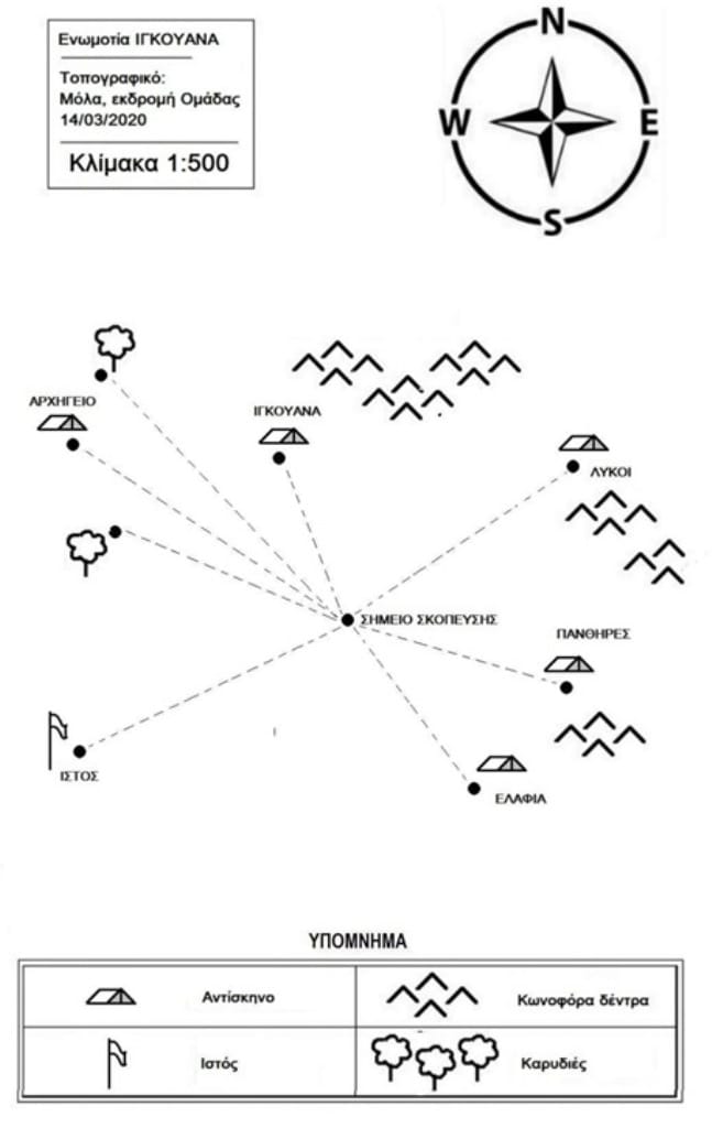 Τέλος, προσθέτεις το Υπόμνημα του σχεδιαγράμματος σου με τα σύμβολα που χρησιμοποίησες, την ένδειξη του Βορρά και σημειώνεις ημερομηνία, όνομα κλίμακα και τα στοιχεία της περιοχής (θέση κ.α.) που αποτυπώνει το σχεδιάγραμμα.