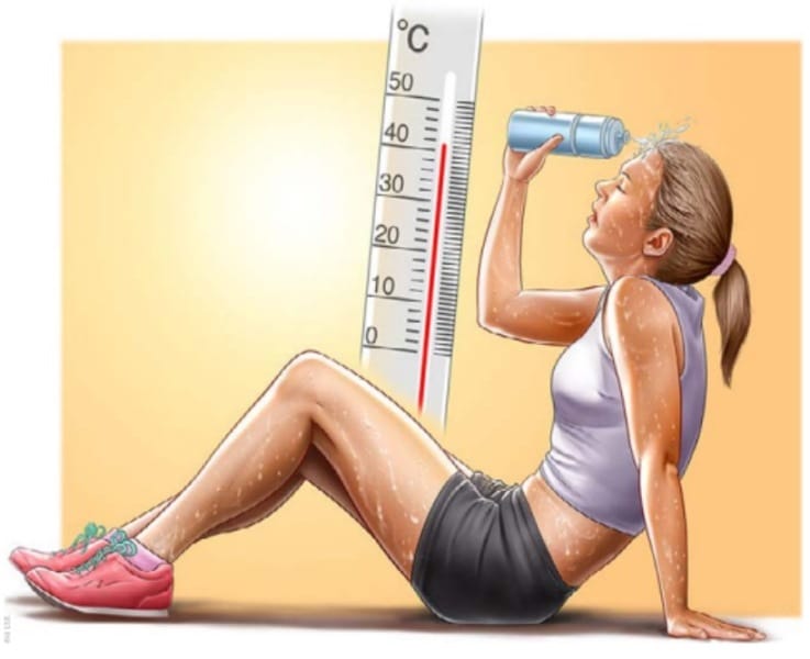 - Πίνε άφθονα υγρά σε τακτά χρονικά διαστήματα. Η αφυδάτωση βλάπτει τις θερμορρυθμιστικές ικανότητες του οργανισμού. Μην περιμένεις να διψάσεις για να πιεις νερό.