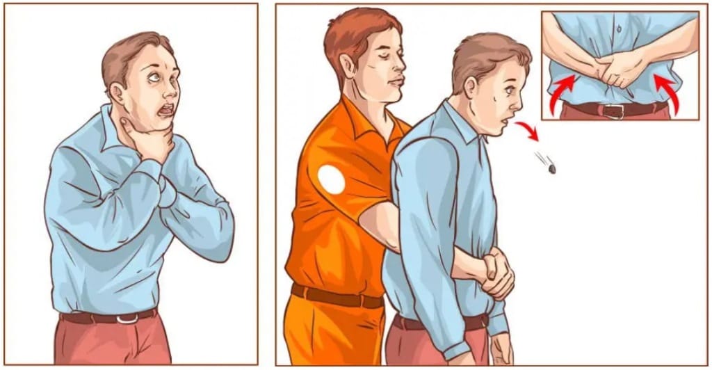 - Σφίξε με τα χέρια σου προς τα μέσα και προς τα πάνω γρήγορα και δυνατά. Επανάλαβε αρκετές φορές αυτή την πίεση στο στομάχι μέχρι το ξένο σώμα να ξεκολλήσει και να αποβληθεί.