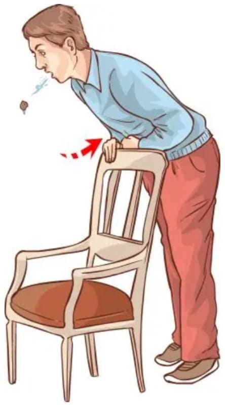 - Αν η απόφραξη εξακολουθήσει, πήγαινε σε μια κόγχη, όπως ένα τραπέζι ή η πλάτη μιας καρέκλας και πίεσε εκεί που τελειώνει το στέρνο, ακριβώς στην ξιφοειδή απόφυση.