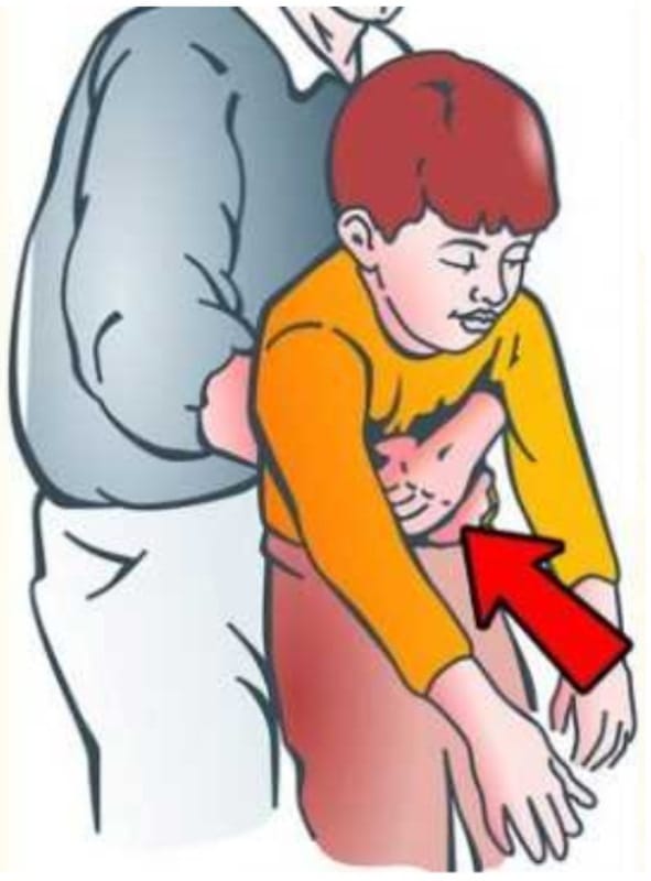 - Αν εξακολουθήσει να υπάρχει απόφραξη, εφάρμοσε πέντε (5) κοιλιακές ώσεις με λαβή Heimlich, ακριβώς κάτω από την ξιφοειδή απόφυση.